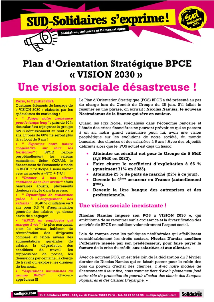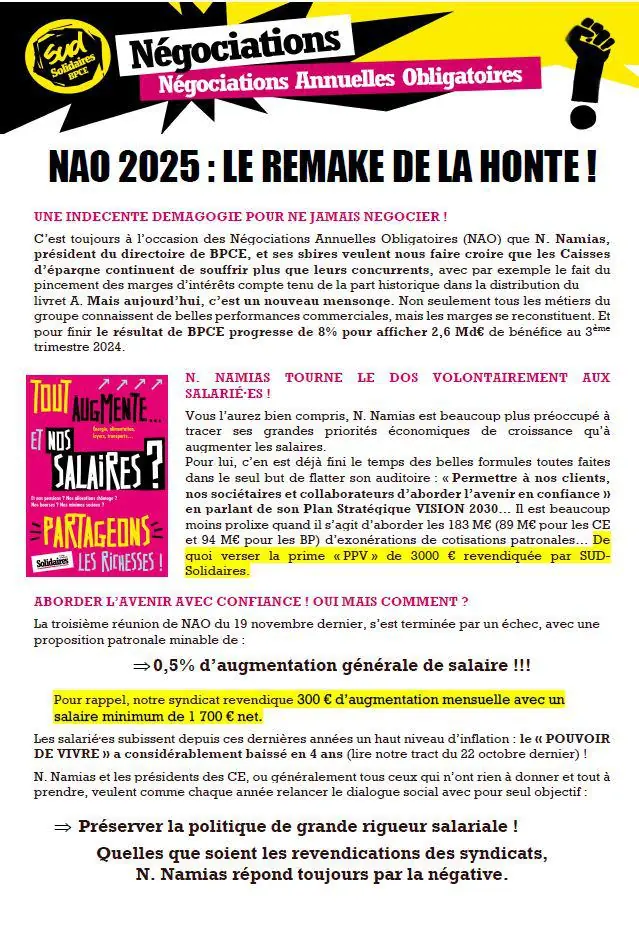 SUD Solidaires BPCE dénonce avec force le choix de Nicolas NAMIAS : orienter l’épargne vers les marchands de canon. Ce financement, présenté comme une fierté, aura demain un prix bien réel : celui des vies civiles innocentes. Plutôt que d’alimenter la machine de guerre, notre groupe devrait investir dans un avenir juste, solidaire et écologique.