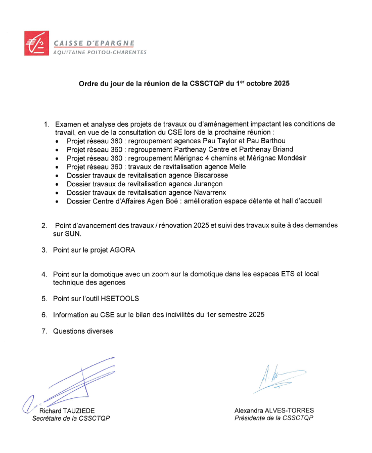 Ordre du jour de la CSSCTQP du 01/10/2025