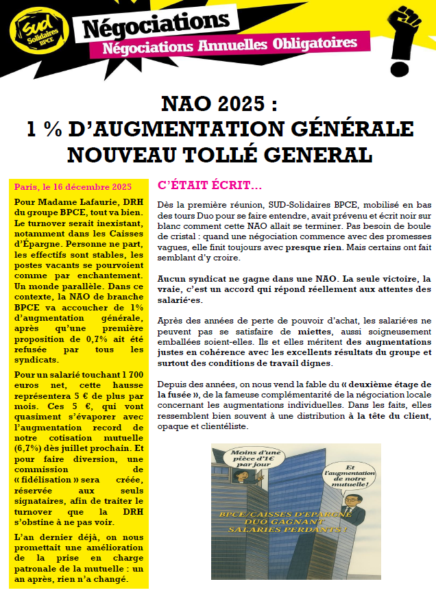 Dès la première réunion, SUD-Solidaires BPCE, mobilisé en bas des tours Duo pour se faire entendre, avait prévenu et écrit noir sur blanc comment cette NAO allait se terminer. Pas besoin de boule de cristal : quand une négociation commence avec des promesses vagues, elle finit toujours avec presque rien. Mais certains ont fait semblant d’y croire.