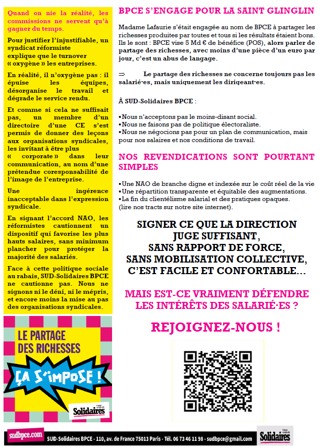 Madame Lafaurie s’était engagée au nom de BPCE à partager les richesses produites par toutes et tous si les résultats étaient bons. Ils le sont : BPCE vise 5 Md € de bénéfice (POS), alors parler de partage des richesses, avec moins d’une pièce d’un euro par jour, c’est un abus de langage.
