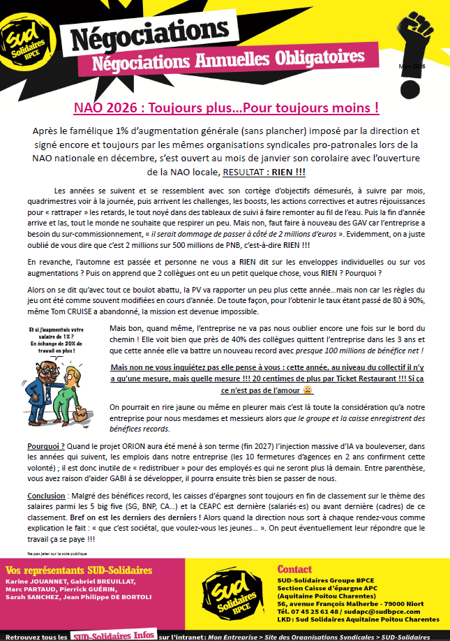Après le famélique 1% d’augmentation générale (sans plancher) imposé par la direction et signé encore et toujours par les mêmes organisations syndicales pro-patronales lors de la NAO nationale en décembre, s’est ouvert au mois de janvier son corolaire avec l’ouverture de la NAO locale, RESULTAT : RIEN !!!
